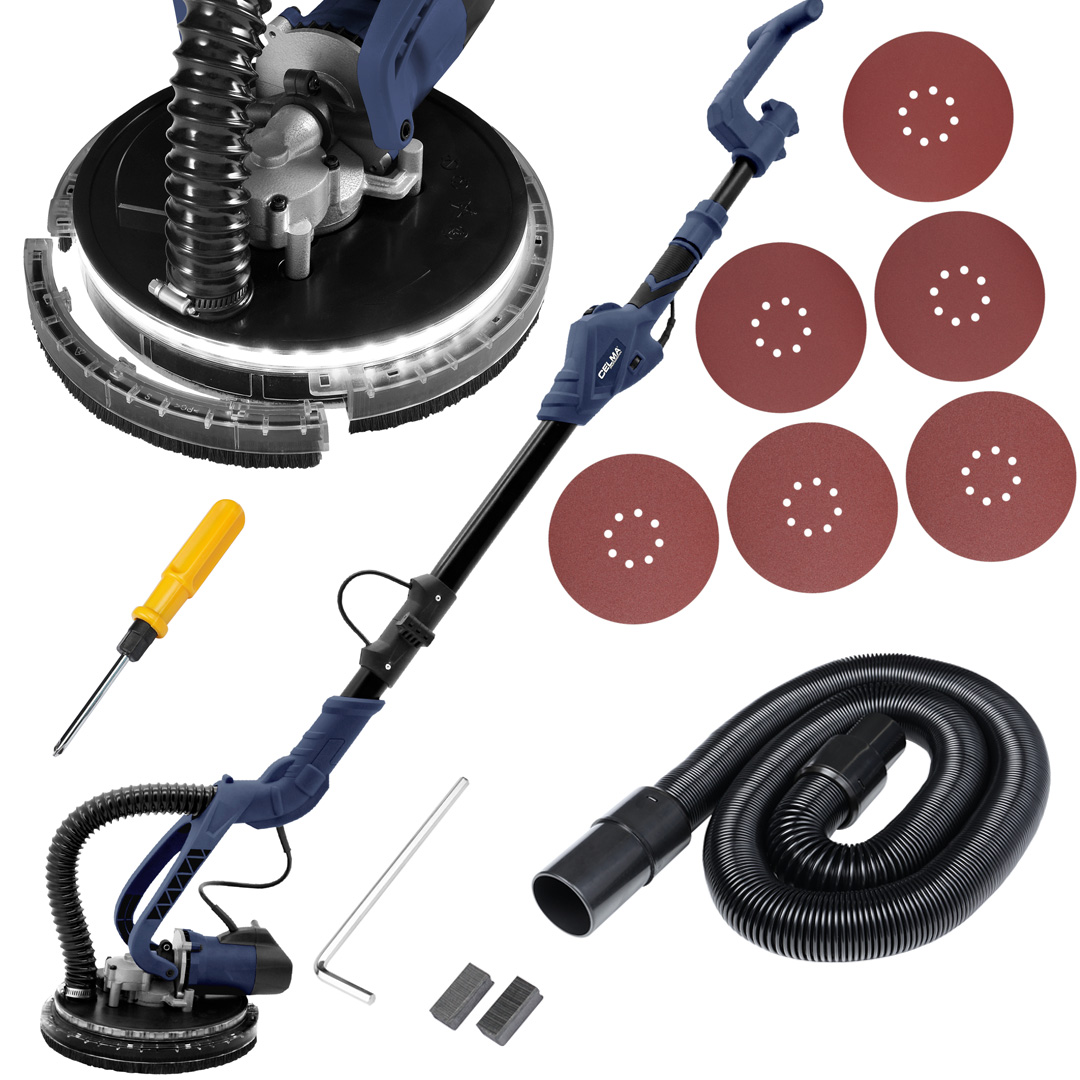 Szlifierka do gipsu CELMA Professional PRBt 225LEO LED przeznaczona jest do szlifowania gładzi gipsowych, wykańczania spoin między płytami gipsowo-kartonowymi oraz usuwania niewielkich nierówności powierzchni tynków. Możliwość podłączenia do odkurzacza przemysłowego umożliwia bezpyłową pracę. Ściągany segment przedni talerza głównego pozwala na dokładniejszą pracę w narożnikach. Urządzenie zaprojektowano do długotrwałej pracy na dużych powierzchniach, takich jak ściany i sufity. Regulowana długość rękojeści, niska waga, dobre wyważenie konstrukcji, gumowane uchwyty oraz długi, 4-metrowy kabel zapewniają komfort pracy i mobilność maszyny. Płynna regulacja obrotów w szerokim zakresie pozwala na dobór prędkości do wykonywanej pracy. Składana konstrukcja umożliwia łatwy transport oraz przechowywanie urządzenia. Urządzenie wyposażone jest w wygodne oświetlenie LED wokół głowicy szlifierskiej, co eliminuje potrzebę dodatkowego źródła oświetlenia. Dzięki temu praca będzie bardziej precyzyjna, a zamierzony efekt łatwiejszy do uzyskania. Lampę w łatwy sposób włącza się za pomocą specjalnego przycisku na głowicy.