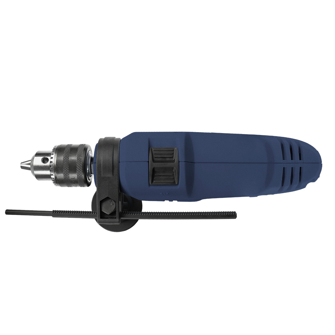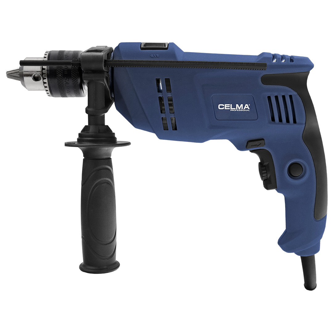 Wiertarka udarowa jednobiegowa CELMA Professional PRCk 13GEO jest przeznaczona do wiercenia otworów w metalu, drewnie, tworzywach sztucznych – przy ruchu obrotowym wrzeciona oraz do wiercenia otworów w materiałach budowlanych – przy ruchu obrotowo-udarowym wrzeciona. Do ustawienia odpowiedniego rodzaju pracy wiertarki służy przełącznik rodzaju pracy umieszczony u góry korpusu wiertarki. Wiertarka PRCk 13GEO może być wykorzystana także do wkręcania i wykręcania wkrętów i śrub o maksymalnej średnicy 6 mm. Dostosowanie odpowiednich prędkości obrotowych do wykonywanej pracy odbywa się w sposób płynny, przy pomocy elektronicznego regulatora obrotów zespolonego z przyciskiem łącznika. Zmianę kierunku obrotów wrzeciona można uzyskać, ustawiając w odpowiednim położeniu dźwignię znajdującą się nad łącznikiem. Ergonomicznie ukształtowana rękojeść główna oraz rękojeść dodatkowa, którą można zamocować zaciskowo w przedniej części wiertarki, sprawiają, że wiertarkę podczas pracy można pewnie trzymać w rękach. W obejmie rękojeści dodatkowej można mocować zderzak do ustalania głębokości wierconych otworów.